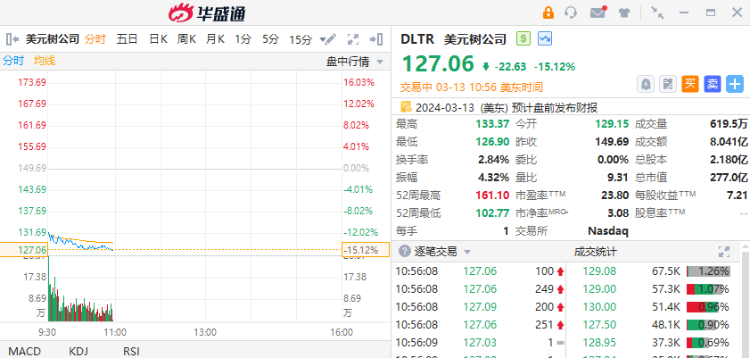 美元树公司绩后跌超15%,财报显示,美元树Q4营收86.4亿美元,同比增长11.9%,不及市场预期的87亿美元;净亏损17.1亿美元,上年同期的净利润为4.522亿美元;每股亏损为7.85美元,上年同期每股收益为2.04美元。