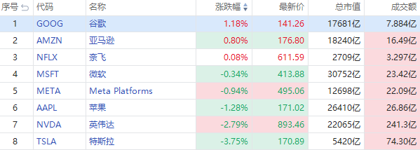华盛资讯3月13日消息,美股早盘,明星科技股走势分化,截至发稿,谷歌涨超1%,亚马逊涨近1%,奈飞跟涨;特斯拉跌近4%,英伟达跌近3%,苹果跌超1%,Meta $META 跌近1%,微软跟跌。