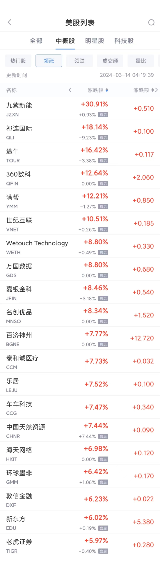 九紫新能涨涨30.30%,祁连国际涨18.14%,途牛涨16.42%,360数科涨12.64%,满帮涨12.36%,世纪互联涨10.51%,乐居涨9.02%,万国数据涨8.80%,