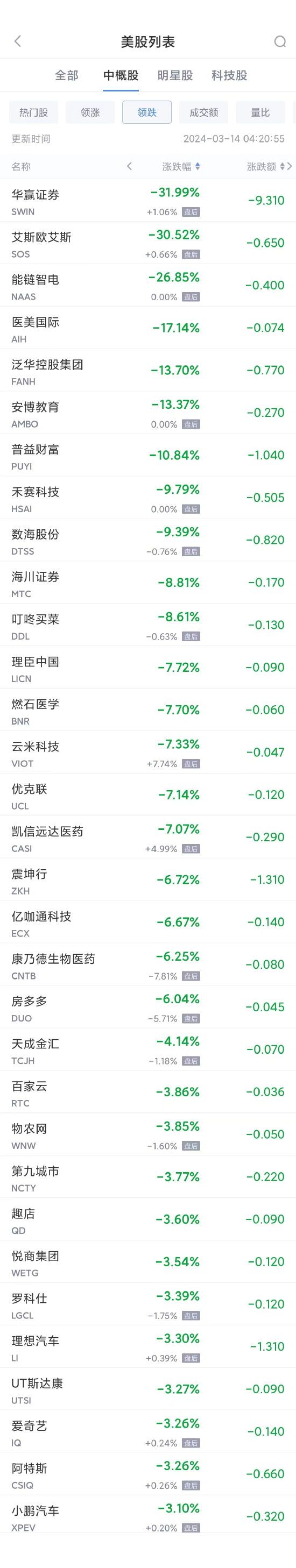 下跌股当中,华赢证券跌31.99%,泛华控股集团跌13.70%,普益财富跌10.84%,海川证券跌8.81%,叮咚买菜跌8.61%,亿咖通科技跌6.67%,蔚来跌4.36%,理想汽车跌3.30%,小鹏汽车跌3.10%。