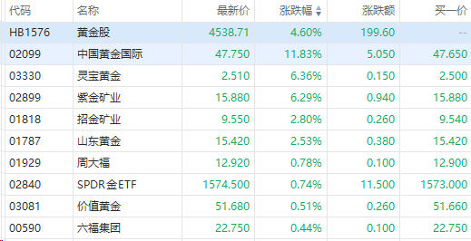 黄金股早盘集体走高,截至发稿,中国黄金国际涨超11%,灵宝黄金、紫金矿业涨超6%,招金矿业涨超2%。