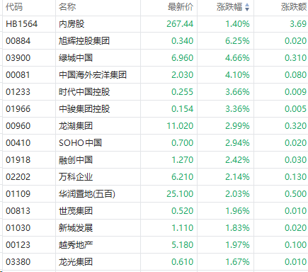 内房股今日普涨,截至发稿,旭辉控股集团涨超6%,绿城中国涨超4%,时代中国控股涨超3%,龙湖集团、SOHO中国、融创中国涨超2%,新城发展、越秀地产、龙光集团涨超1%。