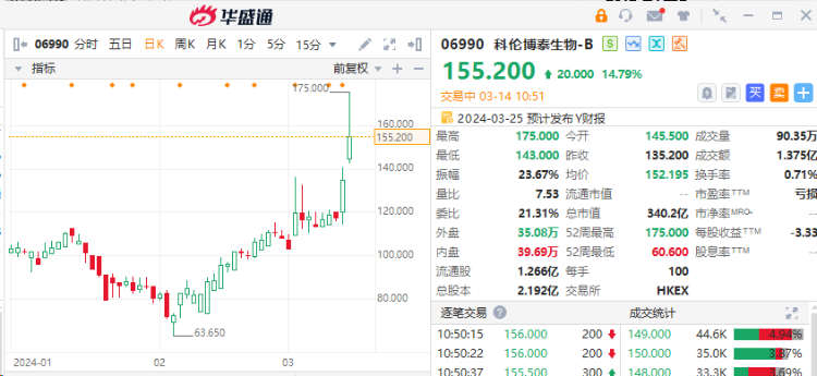 从盘面来看,科伦博泰生物的表现更为突出,该公司在早盘一度大涨近30%。