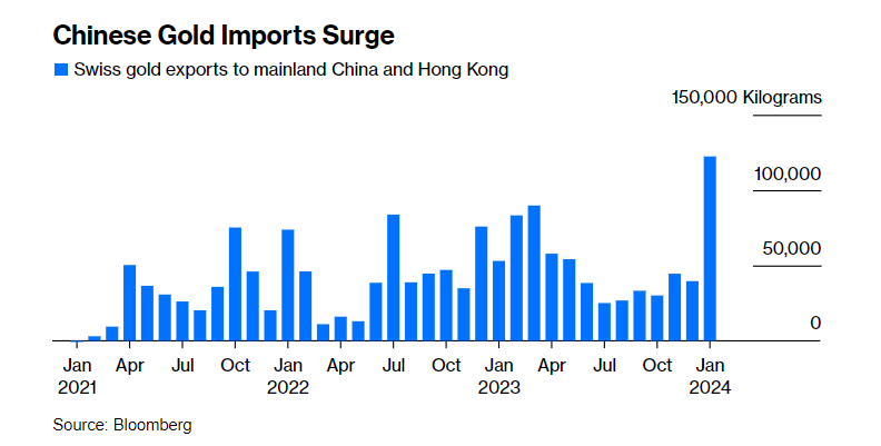 瑞士联邦海关总署的数据显示,今年1月,瑞士对中国的实物黄金出口增长了近两倍。