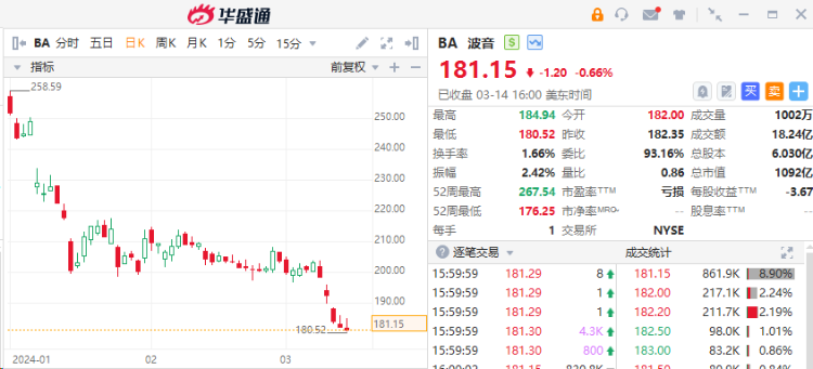波音股票在周三下跌1.03%,收于182.358美元,市值为1112亿美元左右。过去一年,这家航空巨头的股价一直承压,52周波动区间为176.25美元至267.54美元。