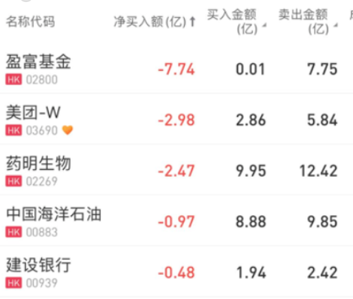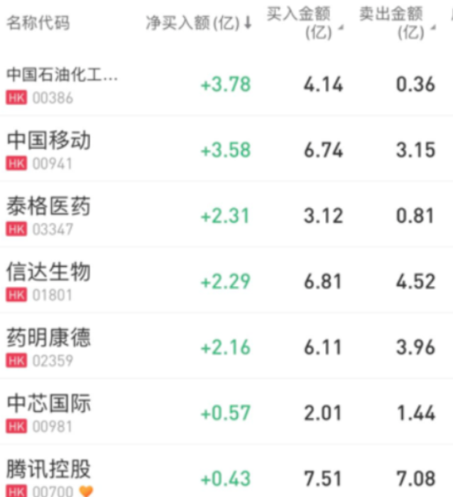 其中,南向资金净买中国石油化工股份3.78亿港元,分别加仓中国移动、泰格医药3.58亿港元、2.31亿港元;净卖出盈富基金7.74亿港元,沽出美团2.98亿港元。