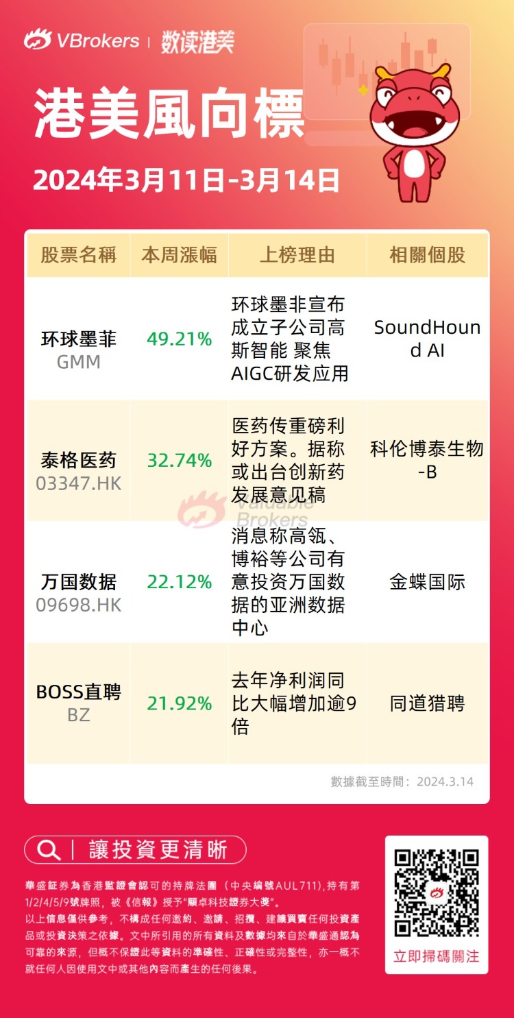 港美风向标 | 乘上AI浪潮!环球墨非周内涨近50%;万国数据周涨22%