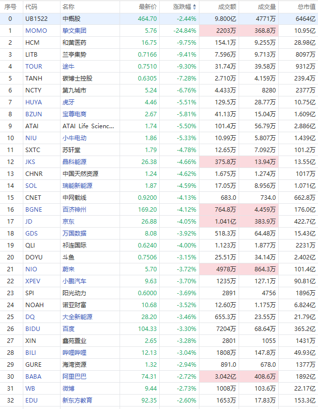 热门中概股普跌,挚文集团绩后跌近25%,和黄医药、途牛跌超9%,百济神州、京东跌超4%,万国数据、蔚来、小鹏汽车、百度、哔哩哔哩跌超3%,阿里巴巴、新东方教育跌超2%。