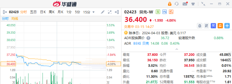 贝壳-W(02423)跌超4%,截至发稿,跌4.08%,报36.4港元,成交额1648万港元。