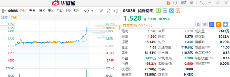 鸿腾精密(06088)午后再涨超10%,本月累涨超40%。消息面上,鸿腾精密近日公布年度业绩,收入同比下滑7%至41.96亿美元,归母净利润同比下滑24%至1.29亿美元。