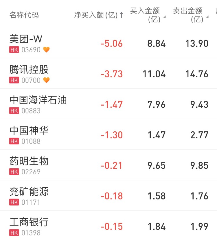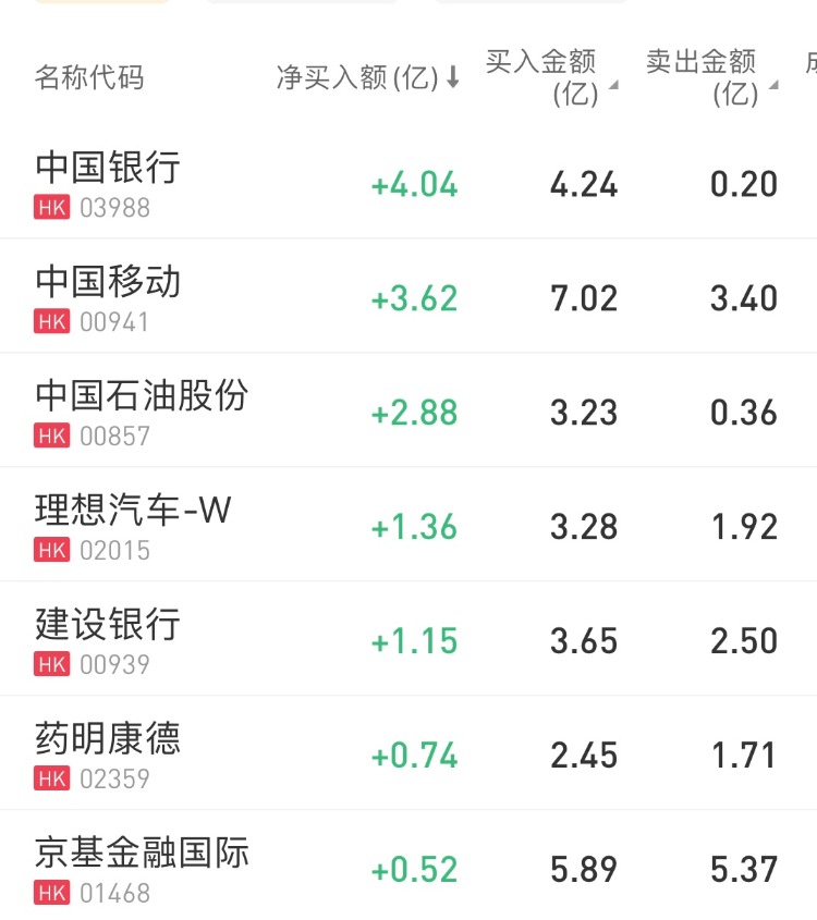 其中,南向资金净买中国银行4.04亿港元,分别加仓中国移动、中国石油股份3.62亿港元、2.88亿港元;净卖出美团5.06亿港元,沽出腾讯3.73亿港元。