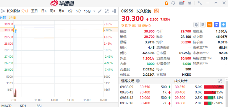 3月18日,长久股份(06959)走高,截止发稿涨7.83%,报30.3港元,成交额46.96万港元。