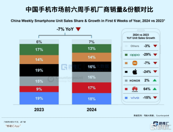 今年前6周,苹果公司在中国的iPhone销量同比下降24%,市占率由2023年的19%下降到了15.7%。与之相对的是,华为前六周销量暴涨64%,市占率从9.4%上升到了16.5%,超越了苹果。