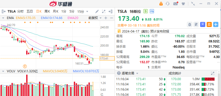周一,特斯拉(TSLA.US)股价走高,截至发稿,该股涨超6%,报173.4美元。