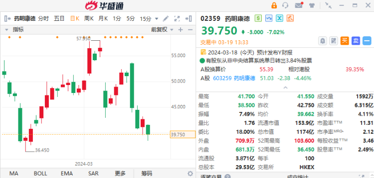今日国内医药龙头药明康德(02359.HK)公布去年业绩过后股价大跌。截至发稿,跌7.02%,报39.75港元。