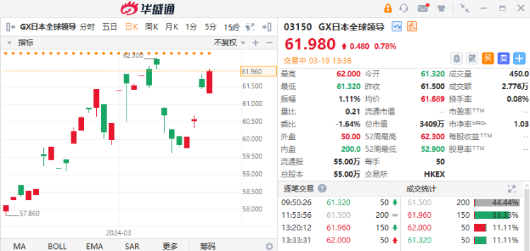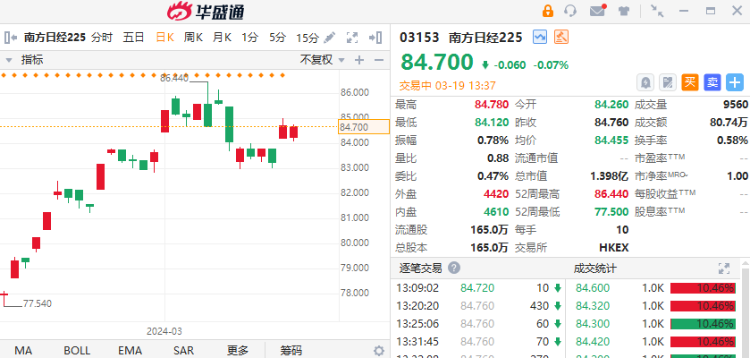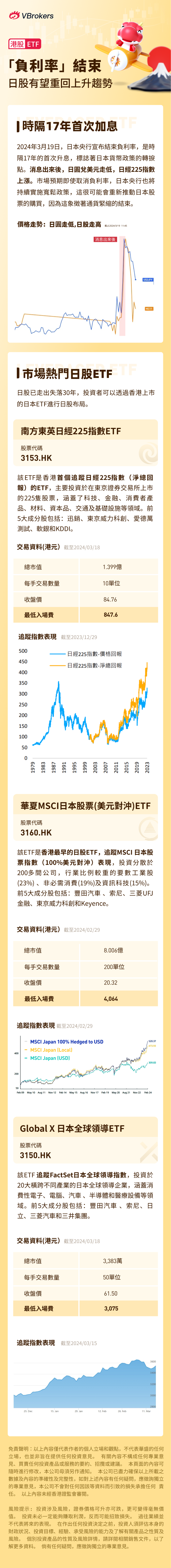 南方东英日经225指数ETF $03153.HK :该ETF是香港首个追踪日经225指数(净总回报)的ETF,主要投资于在东京证券交易所上市的225只股票,涵盖了科技、金融、消费者产品、材料、资本品、交通及基础设施等领域。前5大成分股包括:迅销、东京威力科创、爱德万测试、软银和KDDI。