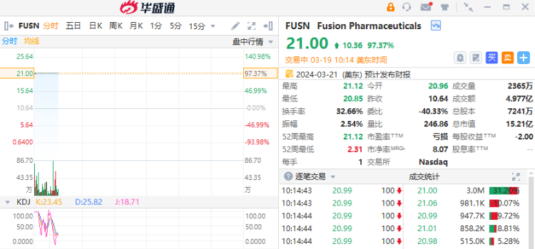 临床阶段生物制药公司Fusion Pharmaceuticals $FUSN 飙涨超97%,最高触及21.12美元,创历史新高。消息面上,阿斯利康周二表示,将以约20亿美元现金收购Fusion Pharmaceuticals,以扩大其肿瘤产品组合。阿斯利康将以每股21美元的价格收购Fusion,较这家美国上市公司周一的收盘价溢价逾97%。