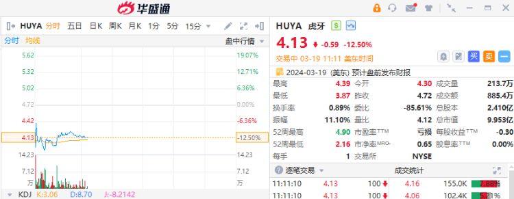 虎牙跌超12%,Q4收入为15.30亿元,同比下降28%;Non-GAAP 每ADS亏损0.79元,较去年同期的1.81元收窄。虎牙直播移动端MAU(月均活跃用户数)达8550万,较去年同期持平。