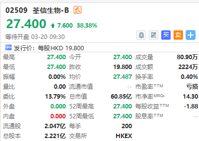 华盛资讯3月20日消息,临床阶段生物科技公司荃信生物-B高开,截至发稿涨38.38%,中签一手账面浮盈1520港元.