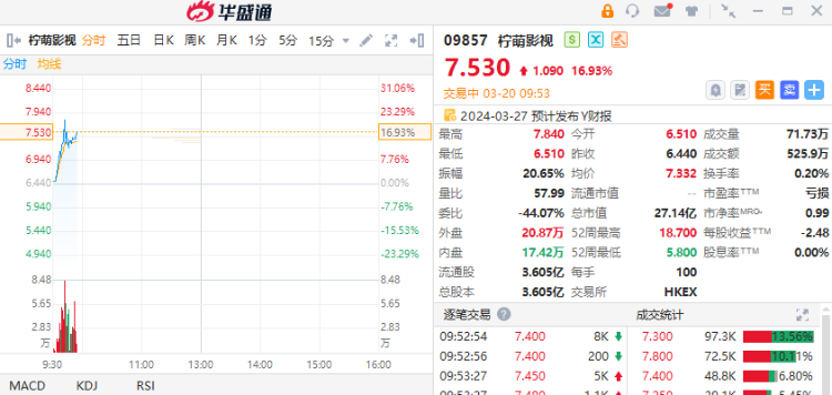 3月20日,柠萌影视(09857)一度拉升逾21%,截至发稿,涨16.93%,报7.53港元,成交额525.9万港元。