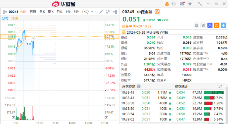 3月20日讯,港股中薇金融早盘股价一度上涨38%,现报0.046港元,涨30%,成交额1018万港元。