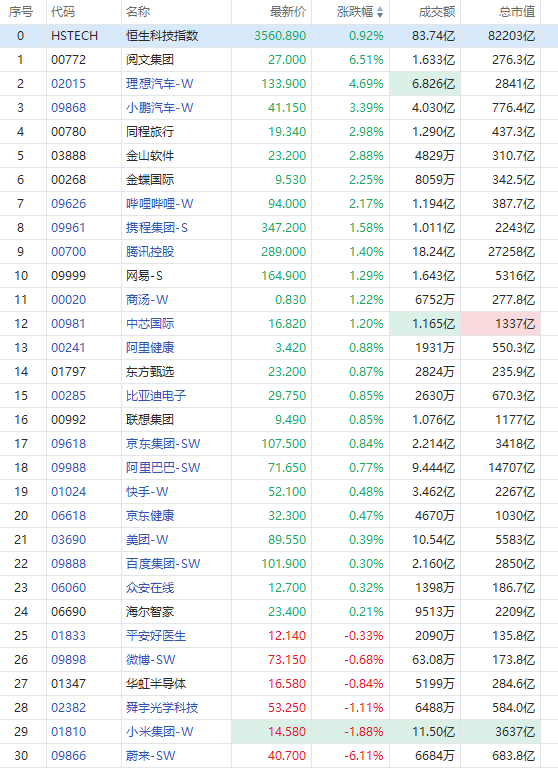 小米集团-W绩后跌近2%;科网股多数走高,阅文集团涨超6%,金山软件、金蝶国际、哔哩哔哩-W涨超2%,腾讯控股、商汤-W涨超1%。