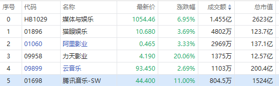 盘面上,科网股普遍上涨,腾讯、网易涨超1%,百度、京东跟涨,小米跌超2%;造车新势力走势分歧,理想汽车涨超4%,蔚来跌超5%;影视娱乐板块全天涨幅居前,力天影业涨超20%;体育用品股齐涨,李宁绩后涨超5%;荃信生物上市首日收涨近24%。