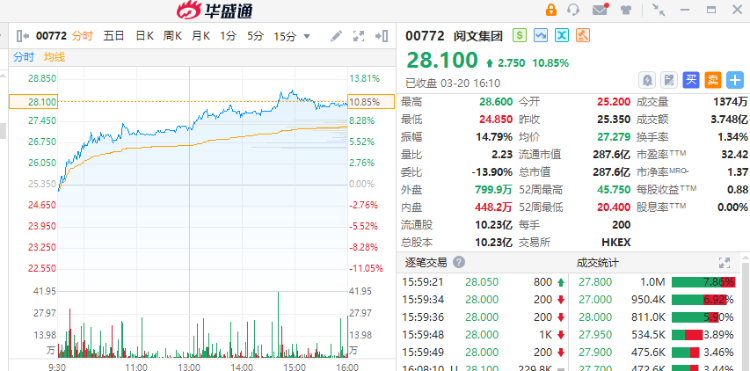 阅文集团涨近11%领跑恒生科指成分股。公告显示,截至2023年12月31日止年度,阅文集团的总收入为70.118亿元人民币(单位下同),同比减少8.0%;经营盈利为7.093亿元,同比增加12.8%;股东应占盈利为8.049亿元,同比增加32.3%;每股基本盈利0.80元,同比增加33.3%。