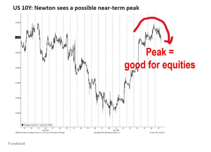 李给出的第二个原因是美国国债收益率走软,这也可能有利于支撑股市。Fundstrat全球技术策略主管马克·牛顿(Mark Newton)认为10年期美国国债收益率已见顶。