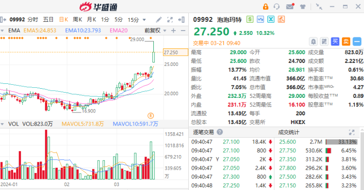 3月21日讯,港股泡泡玛特早盘再升一度再升13%,截至发稿涨逾10%,股价创近两年来新高,公司昨日披露亮眼业绩后股价升7%。