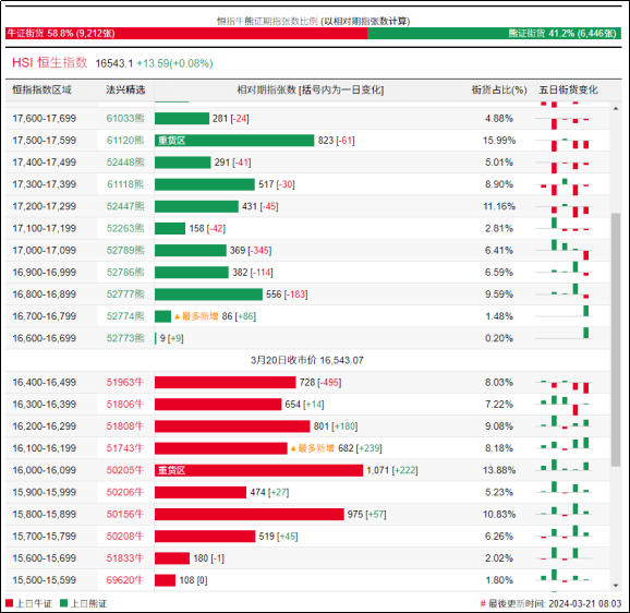 街货分布方面,至周三,恒指牛证街货重货区间主要在收回价16000点至16500点之间,累计相当约3936张期指合约;恒指熊证街货重货区主要在收回价16600点至17100点,累计相当约1402张期指合约。