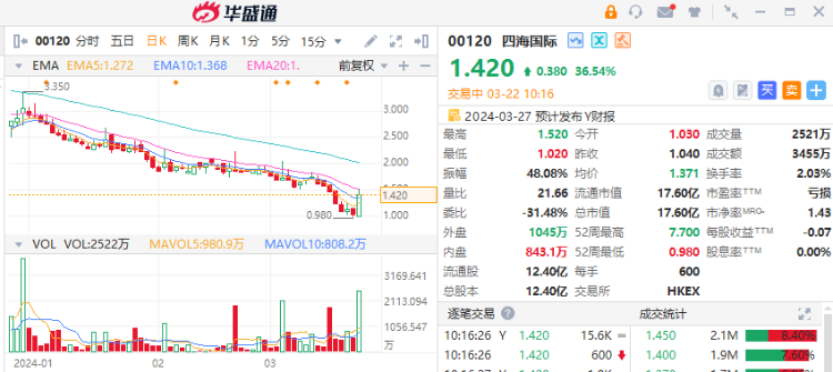 3月22日讯,港股四海国际(00120)早盘超跌反弹逾36%,该股昨日披露业绩预警后股价跌超7%。