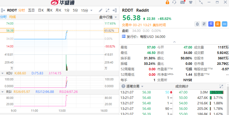 美国社交媒体公司Reddit $RDDT 今晚登陆纽交所,上市首日大涨65%,现报56.38美元/股,公司以每股34美元的价格发售2200万股股票。