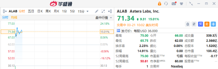 “小英伟达”Astera Labs $ALAB 盘初涨超15%,该公司IPO首日大涨72%。Astera Labs主要研发AI硬件,用来提高数据中心的性能,客户包括英伟达、AMD和英特尔。