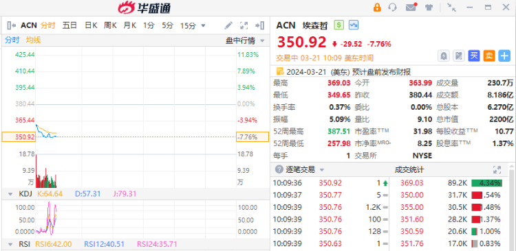 埃森哲(ACN.US)大幅下跌7.76%,报350.92美元。公司2024财年第二财季业绩显示,Q2营收为158亿美元,同比持平,较市场预期低4000万美元。非GAAP每股收益为2.77美元,较市场预期高0.1美元。由于不确定的经济形势促使客户削减咨询服务支出,该公司周四下调了2024财年的收入预期。