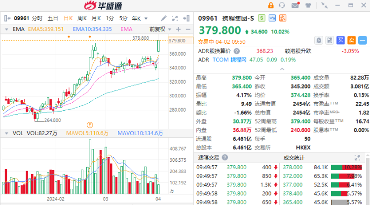 4月2日讯,港股携程集团-S早盘高开高走,截至发稿涨超10%,股价报379.8港元创历史新高。