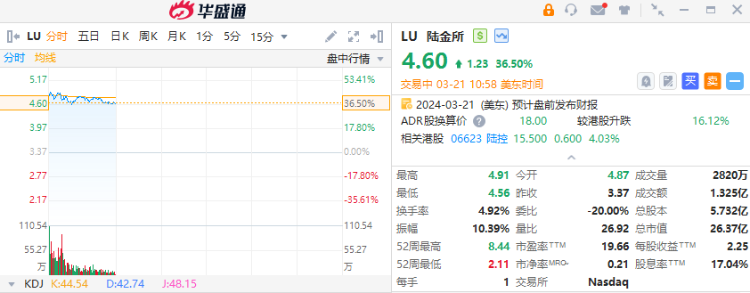 陆金所控股去年营收和净利润大幅下降,不过同期公布的派息公告显示,计划派发100亿元。受此消息影响,陆金所控股大涨超36%,现报4.6美元/股。
