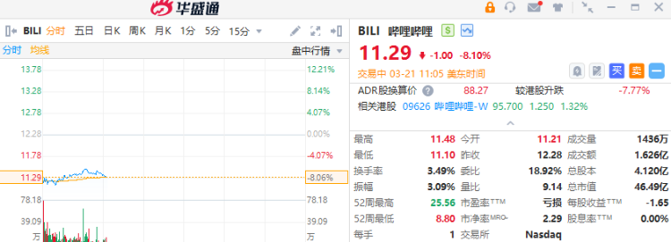 哔哩哔哩盘中大跌超8%,据财联社,阿里巴巴据称将通过出售哔哩哔哩ADR筹资3.578亿美元,价格定在每份ADR11.60美元。