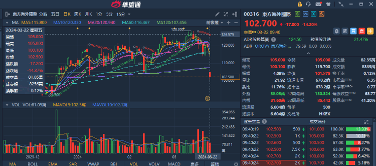 东方海外国际(00316)跌超14%。消息面上,公司发布2023年年度业绩,该集团期内取得收入83.44亿美元,同比减少57.9%;股东应占溢利13.68亿美元,同比减少86.27%;每股基本盈利2.07美元;拟派发末期股息每股0.145美元及第二次特别股息每股0.036美元。