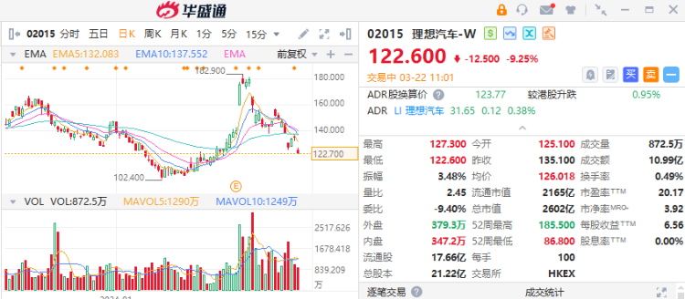 理想汽车-W(02015.HK)2月底到3月初期间迎来一波暴涨后近期走低,截至昨日收盘,理想汽车累计下跌23.02%。