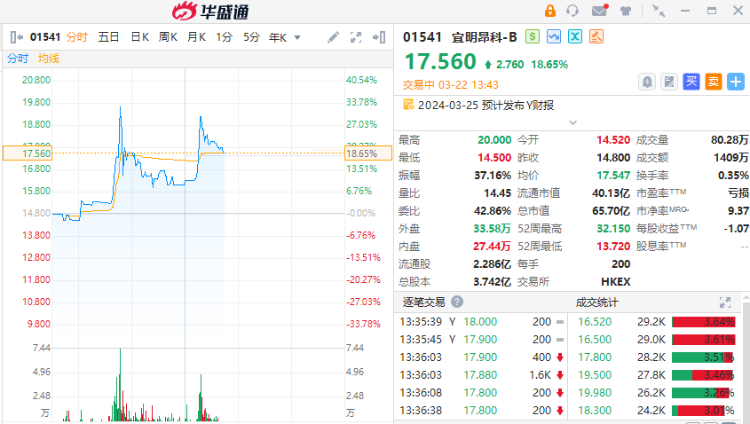 宜明昂科-B(01541)早盘曾快速拉升涨超34%,午后涨幅收窄至上涨18.65%,现报17.56港元,成交额1408.70万港元。