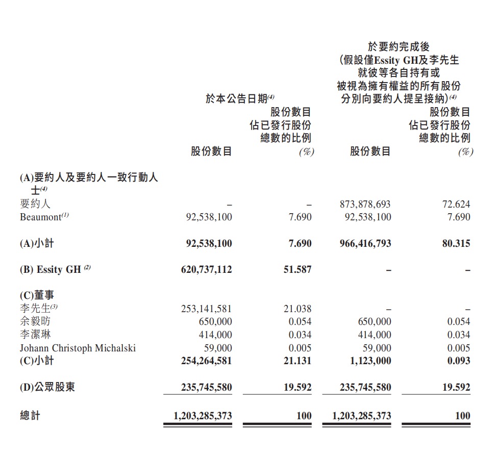维达国际原控股股东Essity为于纳斯达克-OMX斯德哥尔摩交易所上市的公司。此前,瑞典公司Essity宣布已经以每股23.50港元的价格将其持有的全部51.59%维达国际股权出售给了新加坡金鹰集团旗下的亚太资源集团间接全资子公司Isola Castle Ltd(要约人)。