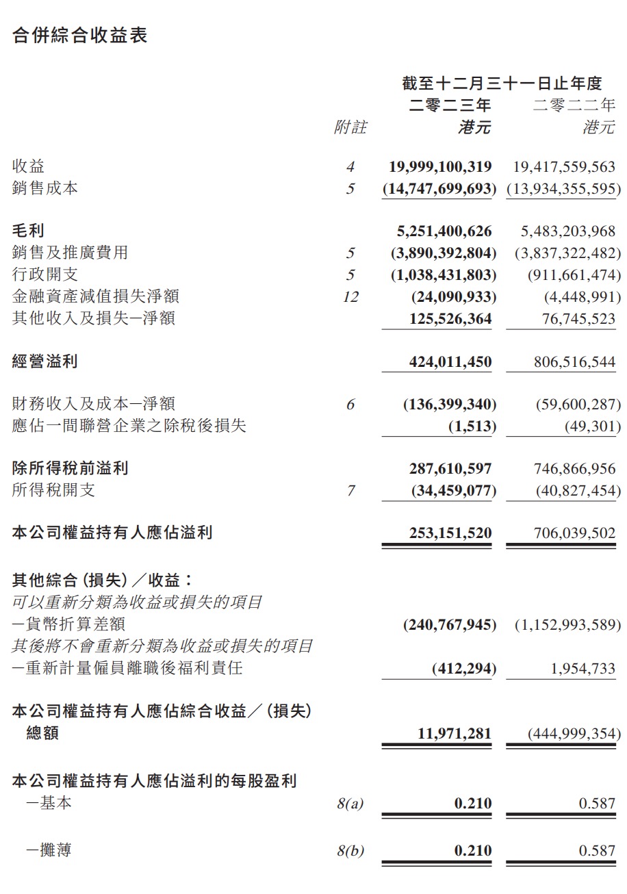 在全年业绩公告当中,该公司管理层表示,2023年宏观经济环境错综复杂,毛利及净利润较去年继续受到通胀压力以市场竞争加剧的负面影响。原材料价格虽然已显著回落,但由于需要时间消化前期采购的原材料库存,对利润率带来了一定的负面影响。