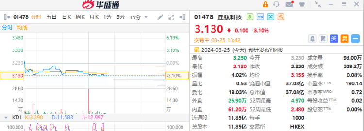 丘钛科技(01478)跌超3%,截至发稿,跌3.1%,报3.13港元,成交额309万港元。