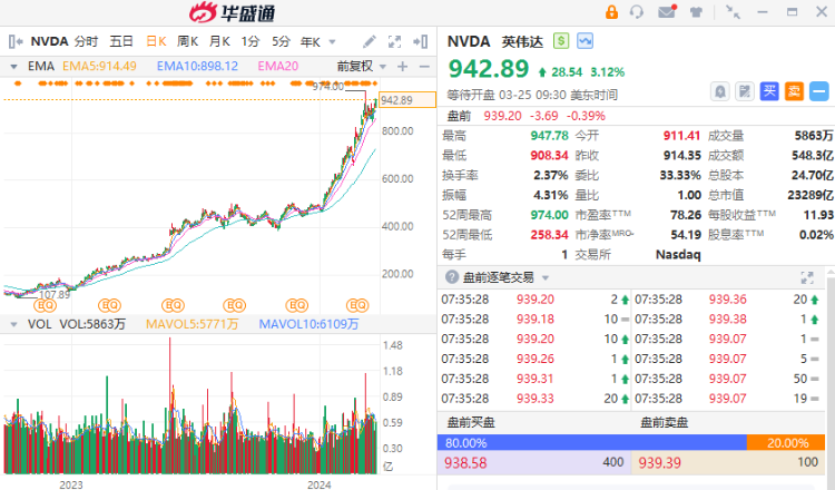 英伟达股价近期再创历史新高,周五收盘价达942.89美元。据道琼斯市场数据,该公司股价已连续第11周上涨,刷新了连续涨幅的记录。