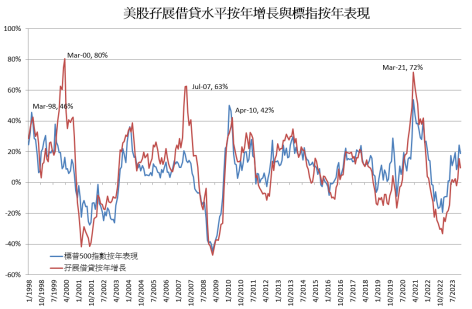 无论如何,从附图1可见,每当孖展借贷按年增速攀升至四成以上时,代表投资者愿意透过借贷(即利用杠杆)进一步增大美股的投资;这某程度可解读为美股投资者risk on情绪十分高涨,亦即美股已进入十分炽热状态。当这孖展指标确认掉头向下,并再度跌穿四成门槛,标指(美股)往往亦在相若时间,见周期顶部并转势向下。