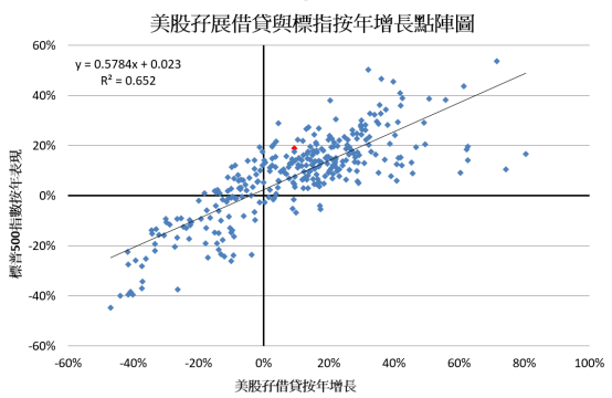 要量度美股(甚至其它市场)是否有泡沫,或可以透过一些数学模型检测;至于,要估算泡沫何时有爆破风险,或可以从投资者对美股风险胃纳(risk appetite)取态找到端倪。由美国金融业监管局(FINRA)统计的美股孖展借贷表现,可见其增速,与标普500指数按年表现大致呈亦步亦趋(图1);过去逾25年数据,两者关连系数达0.8以上甚高水平。值得补充的是,由于两者表现异常密切的原故,故透过简单的廻归(regression)分析,亦可以有效地透过美股孖展借贷数据,预测标指的表现(图2)。
