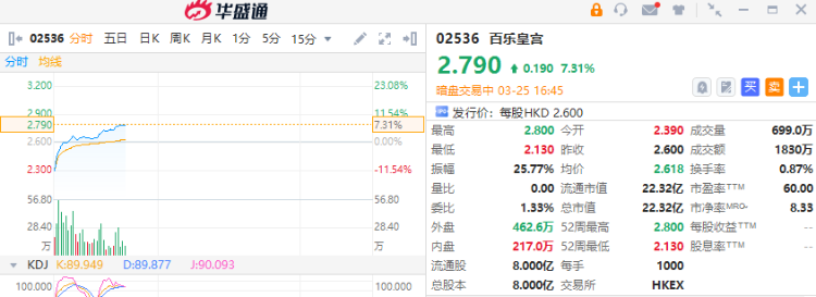 华盛资讯03月25日讯,港股百乐皇宫正在暗盘交易中,截至发稿涨7.31%,报2.79港元/股,每股发行价2.6港元,每手1000股,中签一手账面浮盈190港元,最新总市值超22亿港元。该股预计将于3月26日正式挂牌上市,配售结果将于今日晚间披露。