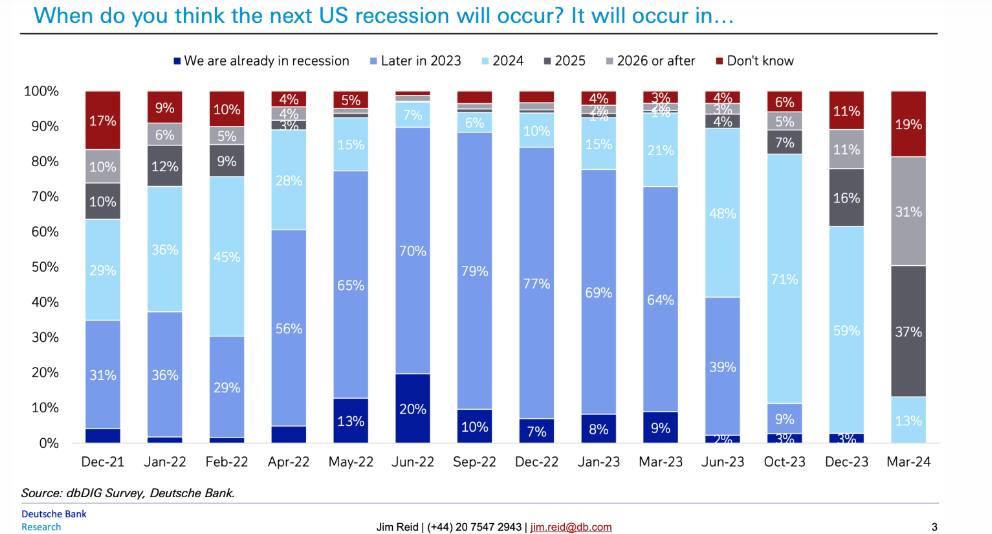尽管如此,许多专家仍难以预测美国经济的未来,这表明2024年确实是经济不确定的一年。约19%的受访者表示,他们“不知道”美国下一次衰退何时会发生,而一年前这一比例仅为3%。