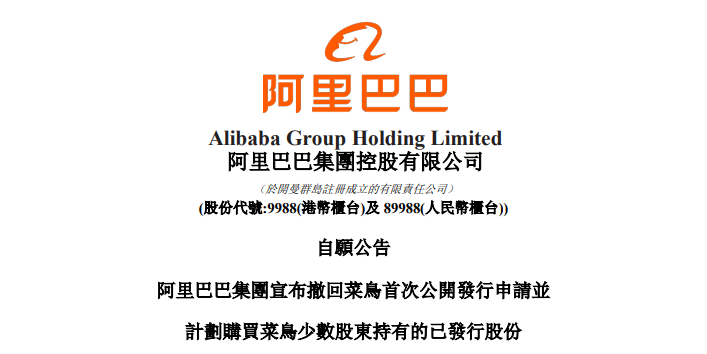阿里巴巴发布公告:物流子公司菜鸟智慧物流网络有限公司已撤回其在香港联交所的首次公开发行及上市申请。